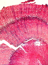 Morphology H, 10 - 40cm Ecology hill and mountain meadow Chorology European, W-Asian Xylem Distinct rings, semi-ring porous, vessels solitary, simple perforation, vessel diameter 30-50 µm, fibers with large pits, fibers thin-to thick-walled, parenchyma apotracheal, rays 1 to 3 cells in width, all cells upright, crystals absent. Xylem-Code Phloem Uniform cortex, distinct ray dilatations, belt of sclereids, with a few crystal druses. Arrangement of periderm cells not very regular. Explanations For explanations please see the Feature Characteristics. | Cross section Tangential section Radial section Bark | |