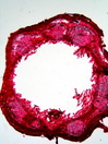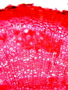 Morphology H, 5 - 10 cm Ecology subalpine and alpine Chorology Apine, Pyrenees Xylem Distinct rings, semi-ring porous, vessels solitary, simple perforation, vessel diameter 20-40 µm, fibers with large pits, fibers thin-to thick-walled, parenchyma apotracheal, rays absent, Xylem-Code Phloem Uniform cortex, multilayered periderm with regular arranged cells. Explanations For explanations please see the Feature Characteristics. | Cross section | |