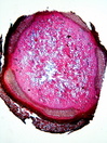 Morphology H, 5 - 10 cm Ecology subalpine and alpine Chorology caucasian Xylem Distinct rings, semi-ring porous, vessels solitary, simple perforation, vessel diameter 20-40 µm, fibers with large pits, fibers thin-to thick-walled, parenchyma apotracheal, rays uniseriate, homocellular with square and upright cells. Xylem-Code Phloem Uniform cortex, multilayered periderm with regular arranged cells. Explanations For explanations please see the Feature Characteristics. | Cross section | |