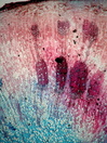 Morphology H, 5 - 10 cm Ecology hill and mountain meadow Chorology Eurasian Xylem Distinct rings, semi-ring porous, vessels in long radial rows, thick-walled, simple perforation, alternating intervessel pits, vessel diameter 15-30 µm, fibers absent, parenchyma pervasive, rays absent. Vascular bundle form remaining, rays with crystal druses. Xylem-Code Phloem Uniform cortex, with crystal druses, multilayered periderm with regular arranged cells. Explanations For explanations please see the Feature Characteristics. | Cross section | |