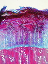 Morphology N 80-200 cm Ecology hill and mountain meadow Chorology W-North America Xylem Distinct rings, semi-ring-porous, vessels in diagonal and radial groups, simple perforation, vessel diameter 30-50µm, with thin helical thickenings, fibers with large pits, fibers thick-walled, parenchyma apotracheal, rays uniseriate and 2-3-seriate, homocellular with upright cells Xylem-Code Phloem With phloem and a few larger parenchyma cells, ray dilatations, tissue radially splitted, with prismatic crystal, multilayered periderm with regular arranged cells, mostly compressed. Explanations For explanations please see the Feature Characteristics. | Cross section Tangential section Radial section Bark | |