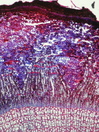 Morphology z, 5-20 cm Ecology subalpine and alpine Chorology S-European mountain Xylem Distinct rings, diffuse-porous, vessels in short radial multiples and in groups, simple perforation, vessel diameter 40-80µm, large vessel-ray pits, fibers with small pits, fibers thin-to thick-walled, parenchyma not to recognize, rays uniseriate, heterocellular with prostrate and a few rows of upright marginal cells. Xylem-Code Phloem With tangential layers of sieve-tubes and parenchyma cells, tangential bands of sclerenchyma cells, with dilatations, with crystal druses and prismatic crystals. Explanations For explanations please see the Feature Characteristics. | Cross section Radial section Bark | |
