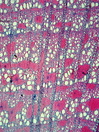 Morphology N 80-150 Ecology mediterranean Chorology W-North America Xylem Distinct rings, semi-ring-porous, vessels in dendritic groups, vessel diameter 30 – 50mµ, simple perforations, with thin helical thickenings, fibers with small pits, fibers thick-walled, parenchyma paratracheal, rays 3-5 seriate, heterogeneous with many square and prostrate and a few rows of upright cells. Xylem-Code Phloem Slide missing Explanations For explanations please see the Feature Characteristics. | Cross section Tangential section Radial section | |