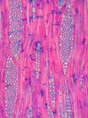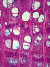 Morphology P 10-20m Ecology mediterranean Chorology E-European W-Asian Xylem Distinct rings, ring porous, often >200 µm in diameter, earlywood vessels solitary, late wood vessels often in tangential, diagonal or even dendritic simple perforations, with helical thickenings fibers thin to thick-walled, parenchyma paratracheal and marginal, ray width 4-8 cells, homocellular with prostrate cells, rays with prismatic crystals in ray cells Xylem-Code Phloem Tangential layers of small sieve cells and big, round, parenchyma cells, sclereids in large tangential rows or large groups, with a few ray dilatations, prismatic crystals in sclereids. Explanations For explanations please see the Feature Characteristics. | Cross section Tangential section Radial section Bark | |