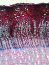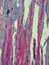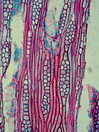 Morphology P 10-20m Ecology subtropical Chorology mediterranean Xylem Indistinct rings, ring porous, 150 -200 µm in diameter, earlywood vessels solitary or in short radial multipels, simple perforations, thin-walled tylosis, fibers thin to thick-walled, parenchyma paratracheal and in large tangential bands, ray width 2-4 cells, heterocellular with central prostrate and a few marginal square or upright cells, with prismatic crystals in axial parenchyma cells Xylem-Code Phloem Wit a few dilatations sclereids absent, many prismatic crystals, with axial laticifers. Explanations For explanations please see the Feature Characteristics. | Cross section Tangential section Radial section Bark | |