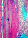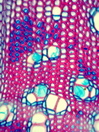 Morphology H, 40 -100cm Ecology hill to subalpine Chorology Subcosmopolitean Xylem Mostly indistinct rings, diffuse-porous, vessels 50-80 µm in diameter, vessels in radial multipels, simple perforations, intervessel pits round and scalariform, with thin- walled tylosis, fibers thin-walled, parenchyma paratracheal, parenchyma in tangential bands which are interrupted by the vessel/fiber strips, ray width >10 cells between vessel/fiber strips, rayless in vessel/fiber strips, homocellular with upright cells with a few crystal druses. Xylem-Code Phloem With groups of sieve-tubes, with solitary sclereids, with a few crystal in axial parenchyma cells. Explanations For explanations please see the Feature Characteristics. | Cross section Tangential section Radial section | |