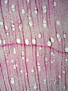 Morphology N , 100-300cm Ecology hill and mountain Chorology SE-Sibirean Xylem Distinct rings, diffuse porous, vessels 30-70 µm in diameter, vessels in radial multipels ray-vessel pits with very small apertures, scalariform perforations with >10 bars, fibers thin to thick walled, fibers with small pits, parenchyma apotracheal-diffuse, rays homocellular, rays 1-3-seriate with prostrate cells, partially with aggregate rays. Xylem-Code Phloem Slide missing Explanations For explanations please see the Feature Characteristics. | Cross section | |