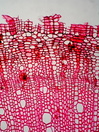 Morphology H, 10 - 40cm Ecology subalpine and alpine Chorology Alpine Xylem Distinct rings, diffuse porous, vessels 60-100 µm in diameter, vessels solitary, simple perforations, pits round in alternating position, fibers with small pits, parenchyma not to recognize, rays uni-seriate, with muscillage cells and raphides. Xylem-Code Phloem Phloem consisting on parenchymatic tissue and, enlarged chambers with raphides surrounded by mucilage. Explanations For explanations please see the Feature Characteristics. | Cross section Radial section | |