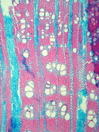 Morphology N 80-150 Ecology mediterranean Chorology W-North America Xylem Indistinct rings, vessels in radial multiples, simple perforations, scalariform intervessel pits, intervessel pits alternate, vessel diameter 50-90 µm, thick-walled fibers, parenchyma scanty paratracheal, ray width 2-3 (4) cells, homocellular with prostrate cells, with a many crystals in rays. Xylem-Code Phloem Sclereids in tangentially arranged square groups, with ray dilatations, with many crystal druses in rays, with mucilage ducts Explanations For explanations please see the Feature Characteristics. | Cross section Tangential section Bark | |