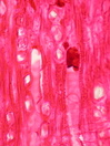 Morphology Z, 40-80cm Ecology mediterranean Chorology SW-European Xylem Distinct rings, diffuse-porous, vessels solitary vessel diameter 30-50µm vessel frequency 200-300 mm2, simple perforations, fibers thick-walled, with large pits, parenchyma apotracheal and scanty paratracheal, rays 1-3 seriate, heterocellular with central prostrate and many marginal square or upright cells, many large prismatic crystals in ray cells. Xylem-Code Phloem Slide missing Explanations For explanations please see the Feature Characteristics. | Tangential section Radial section | |