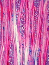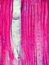 Morphology N, 100-300cm Ecology hill and mountain Chorology Kaukasus Xylem Distinct rings, diffuse porous, vessels solitary, scalariform perforations with >10bars, intervessel pits round, large ray-vessel pits, fibers thin to thick-walled, with distinctly bordered, round pits, parenchyma apotracheal, ray width 3-5 cells, heterocellular with 1-2 upright cells. With a few crystal druses. Xylem-Code Phloem Phloem with tangential layers of sieve-tubes and parenchyma, distinct ray dilatations, with crystal druses. Explanations For explanations please see the Feature Characteristics. | Cross section Tangential section Radial section Bark | |