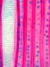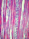 Morphology N 80-200 cm Ecology hill and mountain Chorology W-North America Xylem Distinct rings, ring boundary very small, diffuse-porous, vessels in groups, scalariform perforations with >15 bars, intervessel pitsscalariform and round, vessel diameter 20-40 µm, vessel frequency 200 - 400 mm2, fibers with large pits, fibers thin- to thick-walled, parenchyma not to recognize, rays uniseriate and 3-6 with sheet cells , heterocellular with prostrate and a few upright cells. Xylem-Code Phloem Uniform structure, Explanations For explanations please see the Feature Characteristics. | Cross section Tangential section Radial section Bark | |
