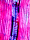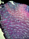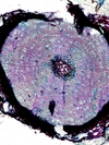 Morphology Ch, succulent plant, 30 ¿ 60cm Ecology Subtropical, thermophile zone Chorology Canary Islands, Gomera Xylem Indistinct rings, isolated vessel/parenchyma groups and tangential vessel/parenchyma bands between vesselless fiber zone (intervascular parenchyma). Vessel diameter 20 ¿ 50µm, vessel frequency vessel frequency 200-500 mm2, reticulate vessel-pitting, septate fibers absent, rayless, crystals absent. Xylem-Code Phloem Sieve cell groups between parenchyma tissue, crystal sand and short acicular crystals in cortex and pith Explanations For explanations please see the Feature Characteristics. | Cross section Tangential section Radial section Bark | |