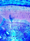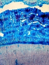 Morphology H, succulent plant, 10-20cm Ecology mountain and subalpine zone, dry site Chorology E-Alpine Xylem Indistinct rings, solitary vessels in the first part of the ring, vessels absent in the second part = intra-annual tangential bands of fibers, pervasive parenchyma in the first part of the ring, first part of the ring with very large rays, later part rayless, crystals absent. Xylem-Code Phloem Distinct sieve cell groups parenchyma in radial rows, with crystal sand, Explanations For explanations please see the Feature Characteristics. | Cross section Tangential section Radial section Bark | |