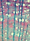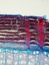 Morphology P, 0,5-1,5m Ecology Hill-and mountain zone Chorology Eurasiatic Xylem Distinct rings, diffuse porous, semi-ring porous, vessels solitary and in groups, scalariform perforations, partial scalariform intervessel pits intervessel pits opposite, with septate fibers, parenchyma difficult to recognize, ray width uni-to multiseriate, heterocellular. Xylem-Code Phloem Tangential layers of collapsed sieve cells, tangential bands of crystal druses. Explanations For explanations please see the Feature Characteristics. | Cross section Bark | |