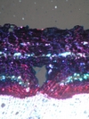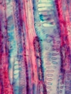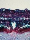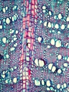 Morphology P, 1-1,5m Ecology Hill zone Chorology W North America, Siberia Xylem Distinct rings, diffuse porous, semi-ring porous, vessels solitary and in groups, scalariform perforations, partial scalariform intervessel pits intervessel pits opposite, with septate fibers, parenchyma difficult to recognize, ray width uni-to multiseriate, heterocellular. Phloem Tangential layers of collapsed sieve cells, tangential bands of crystal druses. Explanations For explanations please see the Feature Characteristics. | Cross section Tangential section Radial section Bark | |