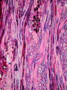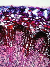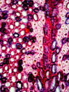 Morphology Z, parasite on Proustia cuneifolia, 30-50cm Ecology mountain zone, dry site Chorology Central Andes, Argentina Xylem Distinct rings (polarized light), diffuse porous, vessels in long radial rows, simple perforation, vessel diameter in earlywood <20µm, fiber pits minutely bordered, fibers thick-walled, apotracheal, ray width 1-8, all ray cells upright, thick-walled ray cells, Keilwuchs Xylem-Code Phloem With sieve cell groups above the vessel/fiber strips. Old sieve cells collapsed, groups of sclereids in cortex. Prismatic crystals present. Explanations For explanations please see the Feature Characteristics. | Cross section Tangential section Radial section Bark | |