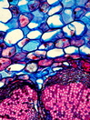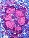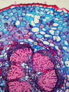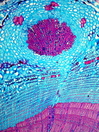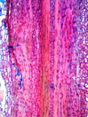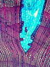 Morphology Z, parasite, on Juniperus sp. 5-10 cm Ecology Pinyon, mountain zone dry site Chorology SW-North- America Xylem Indistinct rings, vessels in groups (look like fibers), vessels thick-walled, simple perforation, opposite vessel pitting, vessel diameter in earlywood <20µm. Some fibers in the cortex- cambial variant? Fibers probably absent, paratracheal parenchyma (looks like apotracheal), parenchyma cells with nuclei, ray width 1-3, all ray cells upright, rays between initial vascular bundles, rays often confluent to axial parenchyma, thin-walled ray cells, crystals absent. Xylem-Code Phloem With sieve cell groups above the vessel/fiber strips. Old sieve cells not collapsed, groups of sclereids in cortex. Crystals in druses. Some fibers in the cortex- cambial variant? Explanations For explanations please see the Feature Characteristics. | Cross section Tangential section Radial section Bark | |