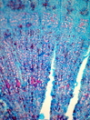 Morphology C, 10-20 cm Ecology boreal, arctic Chorology Siberian Xylem Distinct rings, semi-ring porous, vessels solitary and in groups, vessel diameter <20mµ, vessels thick walled (2mµ), simple perforation, reticulate intervessel pitting, fibers in small groups, most fibers with nuclei, pervasive parenchyma, rays indistinct, if visible width 4-10 thin walled, unlignified, cells, crystals absent. Xylem-Code Phloem Groups of dark staining parenchyma/sieve cell groups arranged in tangential rows, without crystals. Explanations For explanations please see the Feature Characteristics. | Cross section Radial section | |