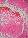 Morphology C, 50-80cm Xylem Indistinct rings, vessels solitary and in groups, vessel diameter 40 - 70 mµ, vessels thick walled (2mµ), fibers thick- walled, simple perforations, intervascular pits round, fibers thick-walled, paratracheal parenchyma, rayless, included phloem concentric with continuous xylem, conjunctive tissue thin-walled, with crystal sand. Xylem-Code Phloem Slide absent. Explanations For explanations please see the Feature Characteristics. | Cross section | |