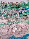 Xylem Indistinct rings, vessels solitary and in small groups, vessel diameter 30-50 mµ, simple perforations, intervascular pits round, fibers thin to thick-walled, paratracheal parenchyma, rayless, included phloem diffuses and concentric with small round groups of phloem, conjunctive tissue lignified, fairly thin-walled, without crystals. Xylem-Code Phloem Uniform anatomy without sieve elements, with crystal sand. Explanations For explanations please see the Feature Characteristics. | Cross section Bark | |