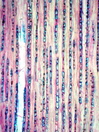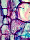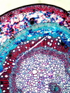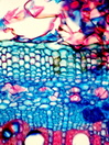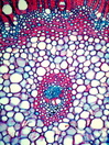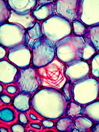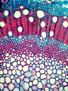 Morphology C, 50-80cm Ecology tropical Chorology Borneo Xylem Rings absent, vessels solitary, vessel diameter 50-100 mµ, simple perforations, intervessel pits round, some cells are filled with dark staining substances (phenols?), fibers thick walled, with distinct small round pits, parenchyma in uniseriate tangential bands, rays uni-seriate with quadrangular and upright cells. Ray are very high (>25 cells). Each ray cell contains a bowl like inclusion. Xylem-Code Phloem Under the epidermis are thin walled parenchymatic cells (assimilating tissue). Below is a belt with central vascular bundles (phloem in the center), embedded in slightly sclerotised cells. An endodermis delimits the cortex from the cork zone consisting square, pitless shoe box like cells. This zone arise from the pericycle zone, which consists mainly of spirally thickened, very long, unlignified cells. The phloem consists on radial grouped sieve cells and parenchyma and spiral cells. Explanations For explanations please see the Feature Characteristics. | Cross section Tangential section Radial section Bark | |