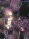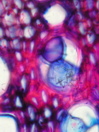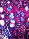 Morphology T, 20-60cm Ecology hill and mountain zone, medium site Chorology E-European Xylem Only one ring, in radial multiples, vessel diameter 30-50 µm, simple perforations, with thin-walled tylosis, round inter-vessel pits, fibers thin-walled, parenchyma not to recognize, rays absent, crystals absent. Xylem-Code Phloem With groups of sieve cells, radial rows of parenchyma cells, with short rhaphides. Explanations For explanations please see the Feature Characteristics. | Cross section Bark | |