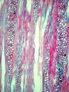 Morphology shrub, 1-2m Ecology subalpine, alpine, medium site Chorology Andes Xylem Distinct rings, semi-ring porous, vessels solitary and in groups, simple perforations, fine spiral thickenings, earlywood vessel diameter 40 - 80µm, fibers thin to thick-walled, few fiber tracheids, parenchyma absent or not to recognize, ray width 4-10 cell, all ray cells prostrate, few prismatic crystals in rays. Xylem-Code Phloem Tangential layers of collapsed sieve cells, irregular groups of sclerenchymatic groups, annual? tangential cracks, distinct ray dilatations, groups of sclereids in cortex, uniform cortex. Crystals absent. Explanations For explanations please see the Feature Characteristics. | Cross section Tangential section Radial section Bark | |