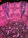 Morphology H, 20-40 cm Ecology hill and mountain zone, medium site Chorology E-European Xylem Distinct rings, diffuse porous, vessels indendritic pattern, simple perforations, earlywood vessel diameter 20 - 35µm, fibers thin to thick-walled, most fibers with nuclei, parenchyma absent or not to recognize, ray width 6-12 cells, with sheet cells, all ray cells square, crystals absent. Xylem-Code Phloem Tangential layers of collapsed sieve cells, tangential bands of sclerenchymatic cells in the cortex on top of vascular bundles. Crystals absent. Explanations For explanations please see the Feature Characteristics. | Cross section Bark | |