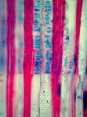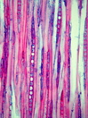 Morphology shrub, 1-2m Ecology hill and mountain zone, medium site Chorology Eastern North Amnerica Xylem Distinct rings, diffuse porous, vessels solitary, often with slightly angular circumference, scalariform perforations with >10bars, intervessel pits round and scalariform (gash-like), fibers thin to thick-walled, with distinctly bordered, round pits, parenchyma apotracheal, rays dominantly uniseriate, seldom biseriate , heterocellular with 2-3 upright cells. With prismatic crystals Xylem-Code Phloem Phloem with few sieve cells, round groups of sclerenchyma cells. Cortex with a continuous band of sclerenchyma. With prismatic crystals Explanations For explanations please see the Feature Characteristics. | Cross section Tangential section Radial section Bark | |