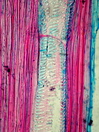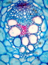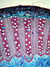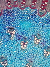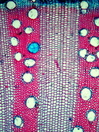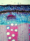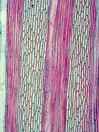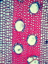 Morphology shrub, 1-2 m Ecology tropical Chorology Polynesia Xylem Without rings, vessels solitary, mostly with, rarely with scalariform simple perforations (few bars), scalariform intervessel pits, fibers storied, thin-to thick-walled, with small slit-like pits, parenchyma paratracheal, around the whole vessel, rays >10 cells, vascular bundle form remaining, all ray cells upright, thin-walled. Pith surrounded by a wavy belt of fibers. With medullary vascular bundles and medullary secretory canals. Xylem-Code Phloem Half-moon like phloem groups, with sclerenchyma cells at the outside of the radial fiber-vessel strips, parenchyma and cortex cells filled with crystal sand. Distinct belt of smaller cells which delimitate phloem and cortex. Explanations For explanations please see the Feature Characteristics. | Cross section Tangential section Radial section Bark | |