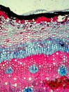 Morphology shrub, - 1 m Ecology hill zone, dry site Chorology SW Northern America Xylem Indistinct rings, vessels solitary vessel diameter 15-25µm vessel frequency 200-300 mm2, simple perforations with, fibers thick-walled, with round pits, conjunctive parenchyma in tangential bands, ray width uniseriate and sometimes 2-4 cells, rays homocellular with square and upright cells, with prismatic crystals in rays. Xylem-Code Phloem Phloem simple structured, tangential band of thick-walled sclereids below the epidermis. Explanations For explanations please see the Feature Characteristics. | Cross section Tangential section Radial section Bark | |