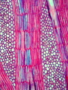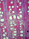Morphology tree 4 m Ecology arid zones, salt tolerant Chorology Sahara Xylem Distinct rings, ring porous, vessels solitary and in groups, simple perforations, intervessel pits round, fibers thin to thick-walled, paratracheal parenchyma, parenchyma locally intangential bands, ray width >10 cells, homocellular with procumbent cells. Storied parenchyma and fibers and vessels, with prismatic crystals. Xylem-Code Phloem Sieve cells between parenchyma cells. They are compressed in older rings. Half-moon-like groups of sclerenchyma, arranged in tangential direction in the phloem. Rays sclerotisised with annual? gaps. Crystals absent Explanations For explanations please see the Feature Characteristics. | Cross section Tangential section Bark | |