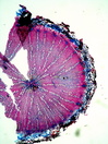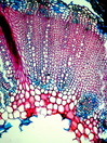 Morphology T, 10-40 cm Ecology hill zone Chorology S-Europ. Xylem Only one ring, vessels in long radial multiples, vessels with thin to thick walls, vessel diameter 20-40 µm, simple perforations, fibers with small to slit like apertures, intervascular pits round, parenchyma paratracheal, rays absent, Xylem-Code Phloem Phloem consists of fairly thick walled, lignified parenchyma and groups of small, unlignified, thin-walled sieve elements. Cortex with big, thin walled parenchyma cells. Explanations For explanations please see the Feature Characteristics. | Cross section Tangential section Radial section Bark | |