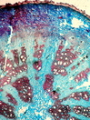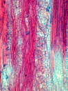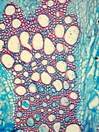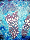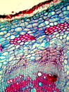 Morphology H, 10 - 40cm Ecology hill zone, dry sites Chorology mediterranean Xylem Distinct and indistinct rings, ring porous and semi-ring porous, vessels solitary, vessel diameter 50-90mµ, with tylosis, vessels thick walled (3mµ), simple perforation, round intervessel pitting, fibers thin to thick-walled or thick-walled, fibers with round bordered pits, parenchyma apotracheal, paratracheal and pervasive, vascular bundle form remaining, rays very large, unlignified with square cells. Crystals absent. Xylem-Code Phloem Phloem with small sieve cells and large parenchyma cells. Distinct ray dilations. Cortex with few fragments of an earlier sclerenchymatic belt. . Explanations For explanations please see the Feature Characteristics. | Cross section Tangential section Radial section Bark | |
