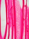 Morphology small tree Ecology tropical rain forest Chorology SE-Asia, Polynesia Xylem Conifer like wood but with large rays. Indistinct ring boundaries, vessels absent, tracheids with big round and scalariform bordered pits (5-7 µm), arranged predominantly uniseriate (1 to 3 seriate). Parenchyma apotracheal, diffuse. Rays are uniseriate and multiseriate (3 to 6 cells in width), heterocellular with 1 to 3 square and upright marginal cells. With sheet cells. Pits in marginal ray cells mostly arranged in axial rows. Ray-pits piceoid (bordered with slit-like apertures). Xylem-Code Phloem Slide missing Explanations For explanations please see the Feature Characteristics. | Cross section Tangential section Radial section | |