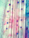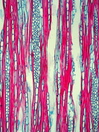 Morphology tree up to 6m Ecology subtropical, mountain zone Chorology Canary Islands Xylem Distinct rings, diffuse to slightly semi-ring porous, vessels rarely solitary, often in short radial groups, vessel diameter 60 ¿ 90 µm, vessels with scalariform perforations with 6-12 bars, with small intervessel pits in opposite position, fibers with distinctly bordered pits with vertical slit-like apertures, vessel frequency 100-150 mm2, parenchyma diffuse in aggregates, rays uniseriate and 3-5 seriate with sheet cells, heterocellular with 3-5 upright cells. Xylem-Code Phloem With ray dialatations and groups of sclereids, with prismatic crystals. Explanations For explanations please see the Feature Characteristics. | Cross section Tangential section Radial section Bark | |