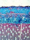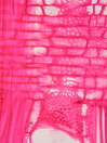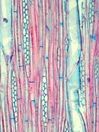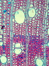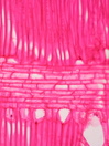 Morphology tree up to 6m Ecology subtropical, mountain zone Chorology Canary Islands Xylem Distinct rings, ring boundary expressed by radial flat fibers, diffuse porous, vessels solitary, and in short radial groups, vessel diameter 80 ¿ 130 µm, vessel frequency 80-100 mm2, vessels with simple perforations, large intervessel pits in alternate position, ray-vessel pits reticulate, fibers with small pits, many septate fibers, parenchyma diffuse, rays 2-4 seriate, heterocellular with 1-2 upright cells, marginal cell often very big. Xylem-Code Phloem With ray dilatations, single fibers in the phloem and groups of sclereids in the cortex, with crystal sand in parenchyma cells. Explanations For explanations please see the Feature Characteristics. | Cross section Tangential section Radial section Bark | |