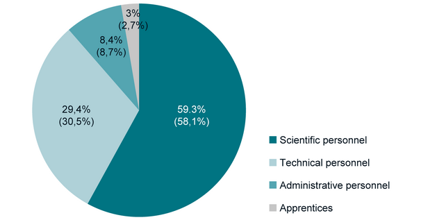 At the end of 2024, WSL's 660 employment contracts amounted to 574,6 full-time equivalents (FTEs). Scientists accounted for roughly 59,3 % of all staff (FTEs). The scientific staff includes 79 doctoral students and 65 post-doctoral researchers. Its staff also included 17 apprentices.