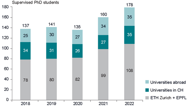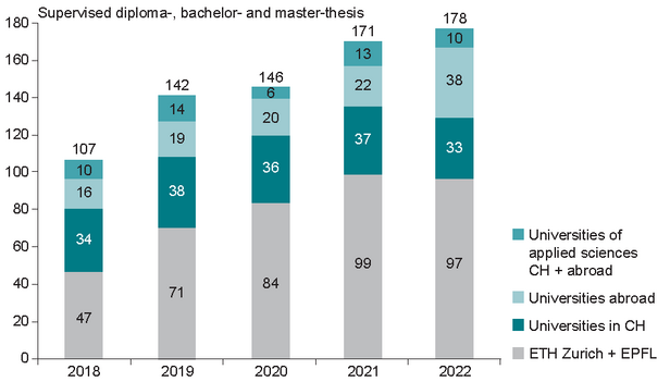 At the end of 2022, WSL had a total of 30 professors at various universities in Switzerland and abroad. In addition to giving university lectures, WSL organised or co-organised several practical continuing training courses, summer and winter schools and a number of events. WSL also supervises theses for bachelor's and master's' degrees and doctoral students. In 2022, WSL researchers supervised 178 doctoral students and 178 theses for bachelor's or master's degrees.