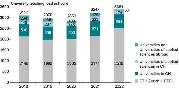 WSL lectures and courses complement university teaching, covering topics in which WSL has special expertise. In 2022, around 140 WSL staff gave a total of 3381 hours of lectures at the two Swiss federal universities, at cantonal universities, at Swiss universities of applied sciences and at tertiary-level institutions abroad. The largest proportion (around 75 %) was given at both Federal Institutes of Technology, especially at ETH Zurich. The lectures and courses of WSL lecturers are administered by the universities and are listed in the respective course catalogues.