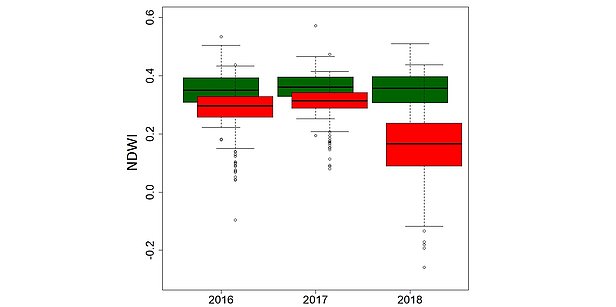 Through the comparison with ground observation data, we were able to show that the vegetation indices (e.g. Normalized Difference Vegetation Index (NDVI) and the Normalized Difference Water Index (NDWI)) can reliably detect prematurely discoloured beech trees (Figure 2). Threshold values derived from vegetation indices can then be used for mapping beech trees with drought symptoms (Figure 3).