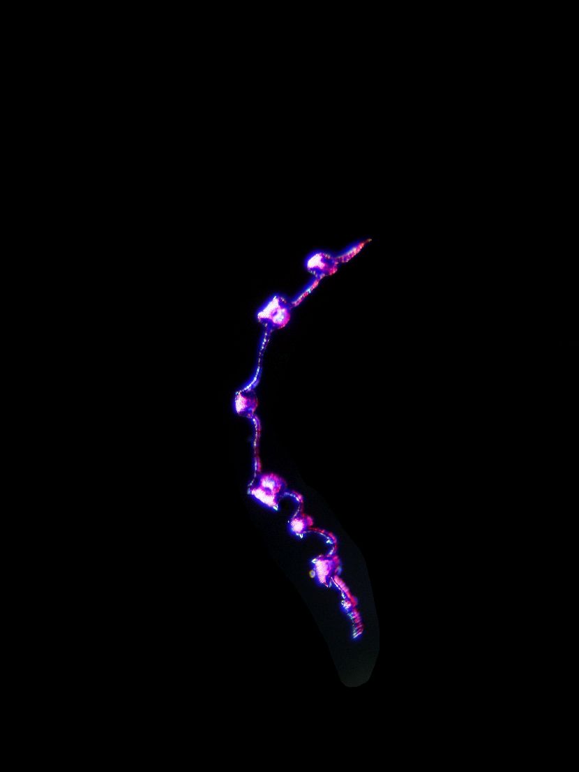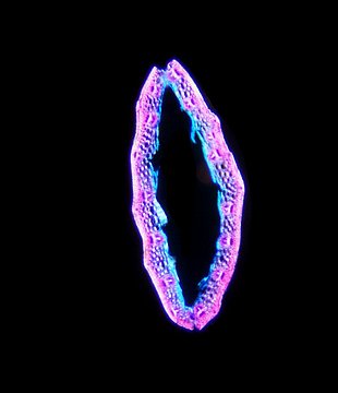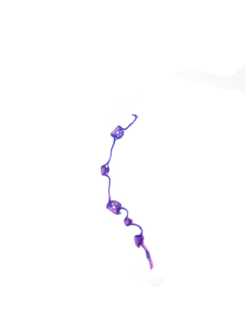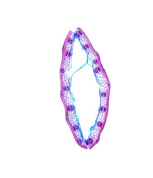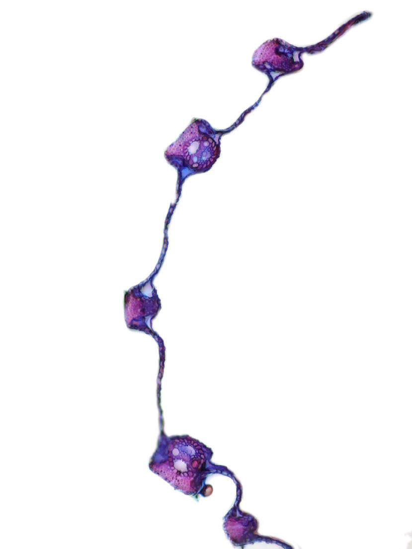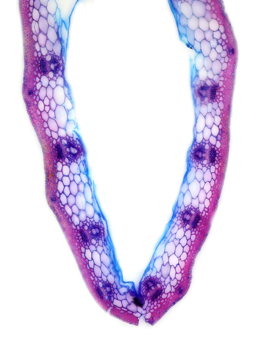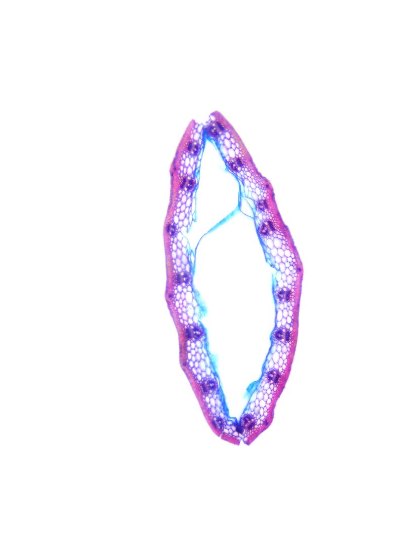 Outline with rips. Upper epidermis cells in one row. Vascular bundles near the lower side of the leaf. Girders extending from the vascular bundle to the lower side of the leaf.