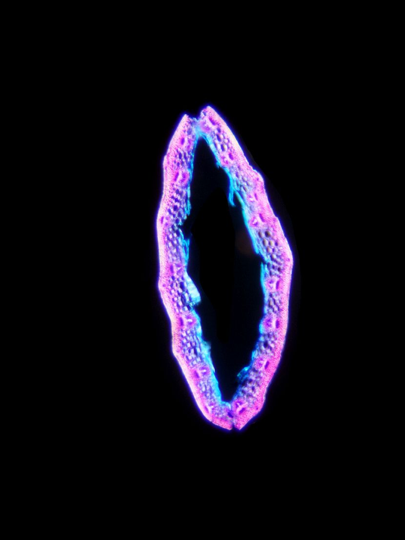 Cross-section round. Outline smooth. Culm center hollow. No visual difference between epidermis cells and sclerenchyma cells. Continuous peripheral sclerenchymatic belt. Large vascular bundles in one row. Small vascular bundles integrated in the sclerench