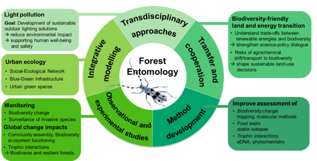 Our group Forest Entomology investigates forest insects in their broadest sense in uncovering the fundamental ecological mechanisms that determine the responses of insects biodiversity and community dynamics to global changes, by linking basic science with applied conservation and urban sustainability.