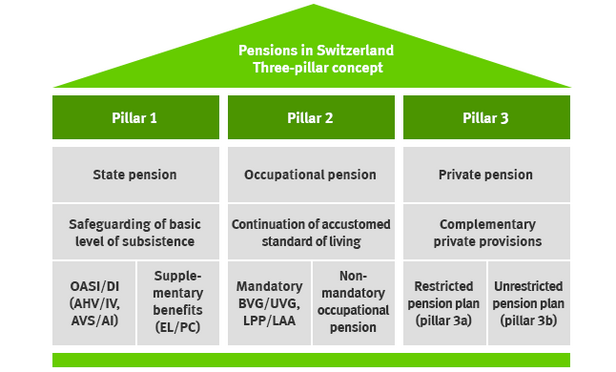 Swiss retirement provision is based on the three-pillar principle. Pillar 1 consists of Old Age and Survivors' Insurance (OASI or AHV) and Invalidity Insurance (IV) as well as supplementary benefits. The 1st pillar is compulsory and should cover basic living expenses. Pillar 2 consists of an occupational pension (pension fund), which is also compulsory. The 3rd pillar is a voluntary private pension. Generally speaking, pillars 2 and 3 together should be enough to maintain your accustomed standard of living after retirement. As a WSL employee, you are insured (unless otherwise specified in the contract) under pillars 1 and 2.