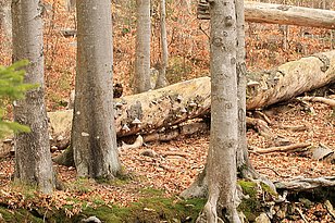 To maintain this biodiversity, the resource deadwood must be present in sufficient quantity over long periods of time. In the former primeval forests, 20-50% of the trees were old or dead at any given time. Today, however, there is often too little of it in managed forests.