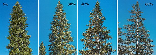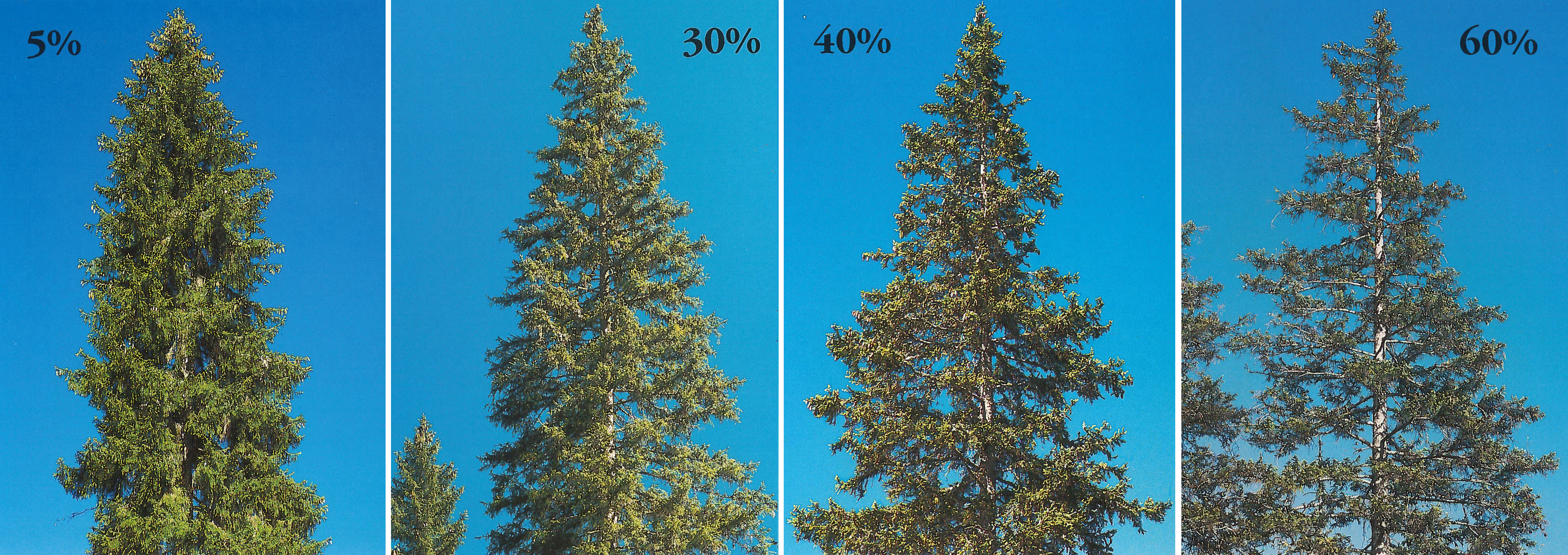 We have assessed crown condition in Swiss forests since 1985. We use international standards for defoliation, defined as the percentage of trees displaying more than 25% leaf or needle loss as compared to a reference tree with full foliage. We also assess how many trees have an abnormal amount of yellow leaves or needles.