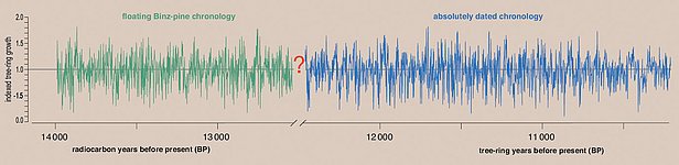 The Central European absolutely dated tree-ring chronology (blue in the graph below) is based on oak and pine trees and ends around 12,500 years before present.