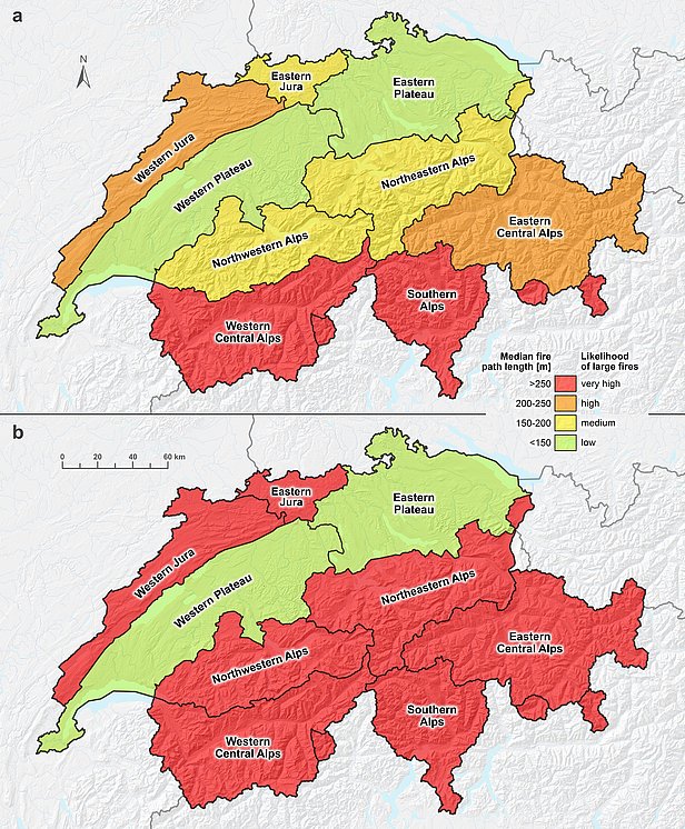 According to the researchers, this clearly shows that the probability of being affected by major fires would increase significantly throughout Switzerland (with the exception of the Central Plateau) if agricultural use were to be abandoned and a complete transition to forestation were to occur (Fig. 3 and Fig. 4).